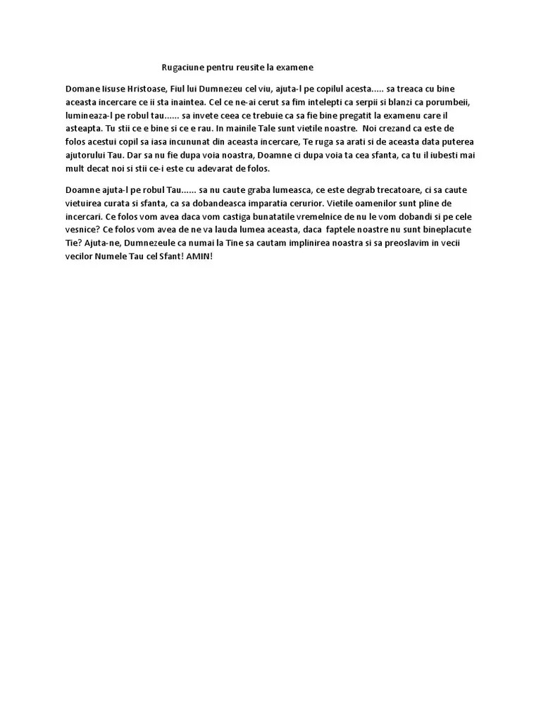 De exemplu, atunci când primești foaia și, chiar dacă ești pregătit, ai un moment în care te pierzi și simți că nu te mai poți regăsi. Cele mai puternice rugăciuni pentru ajutor la examene. „ne rugăm ţie, mult milostive şi îndurate doamne, trimite asupra robilor tăi care sunt în examene, duhul înţelepciunii, al înţelegerii şi al bunei ştiinţe.