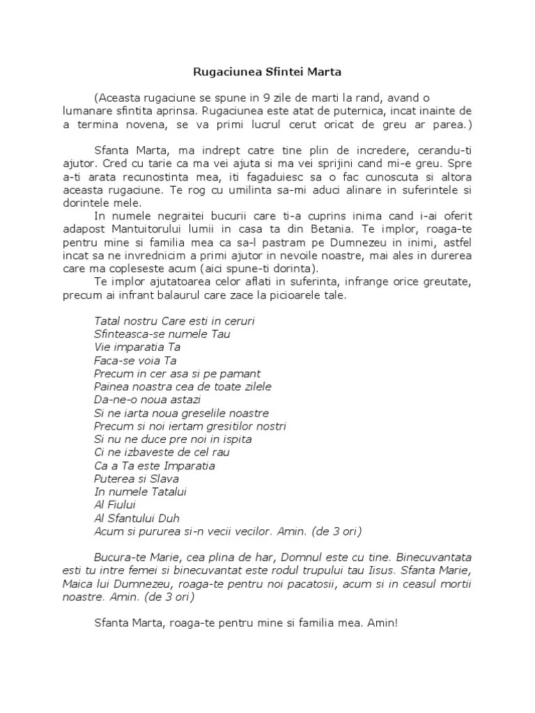Cred cu tărie că … Ritualul constă în rostirea, nouă zile. Rugaciunea este atat de puternica, incat inainte de a termina novena, se va primi lucrul cerut oricat de greu ar parea. 28.07.2010 · rugaciune catre sfanta marta. Prin rugaciune dobandim orice de la domnul, toate lucrurile bune, biruind orice ispita, orice necaz, orice mahnire. Rugaciunea este atat de puternica, incat inainte de a termina novena, se va primi lucrul cerut oricat de greu ar parea.. Aceasta rugaciune se spune fie timp de noua zile consecutiv , fie timp de noua marti la rand, cu o lumanare (preferabil sfintita, dar eu nu am avut sfintita) aprinsa.