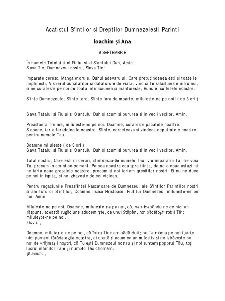 17.05.2012 · acatistul sfintilor ioachim si ana... Acatistul sfinţilor părinţi ioachim şi ana ( 09 septembrie) rugaciunile incepatoare: Acatistul sfinţilor părinţi ioachim şi ana.. S lava tie, dumnezeul nostru, slava tie!